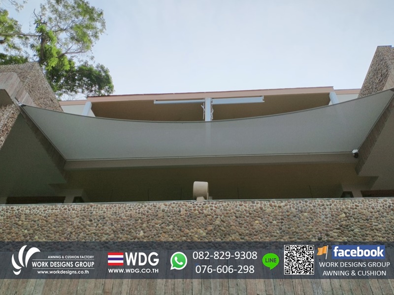 กันสาดติดผนัง มีรูปทรงให้เลือกหลากหลายแบบ ผ้าใบระบายอากาศได้ดีไม่ร้อน ฝนตกไม่เสียงดัง